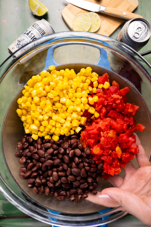 4. Add the tomatoes, black beans, frozen corn, and shredded chicken. Pour the lime juice in and stir.