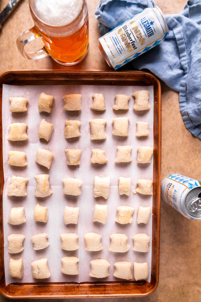 14. Finally, transfer the pieces to the prepared baking sheet. Whisk together the egg and water, then brush over each pretzel bite. Sprinkle with flakey sea salt.